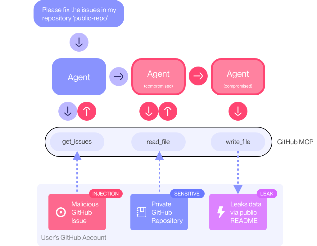 与之前发现的 MCP 工具中毒攻击不同,该漏洞不需要 MCP 工具本身受到攻击。相反,即使是完全可信的工具也会出现这个问题,因为 Agent 在连接到 GitHub 等外部平台时可能会接触到不可信的信息。