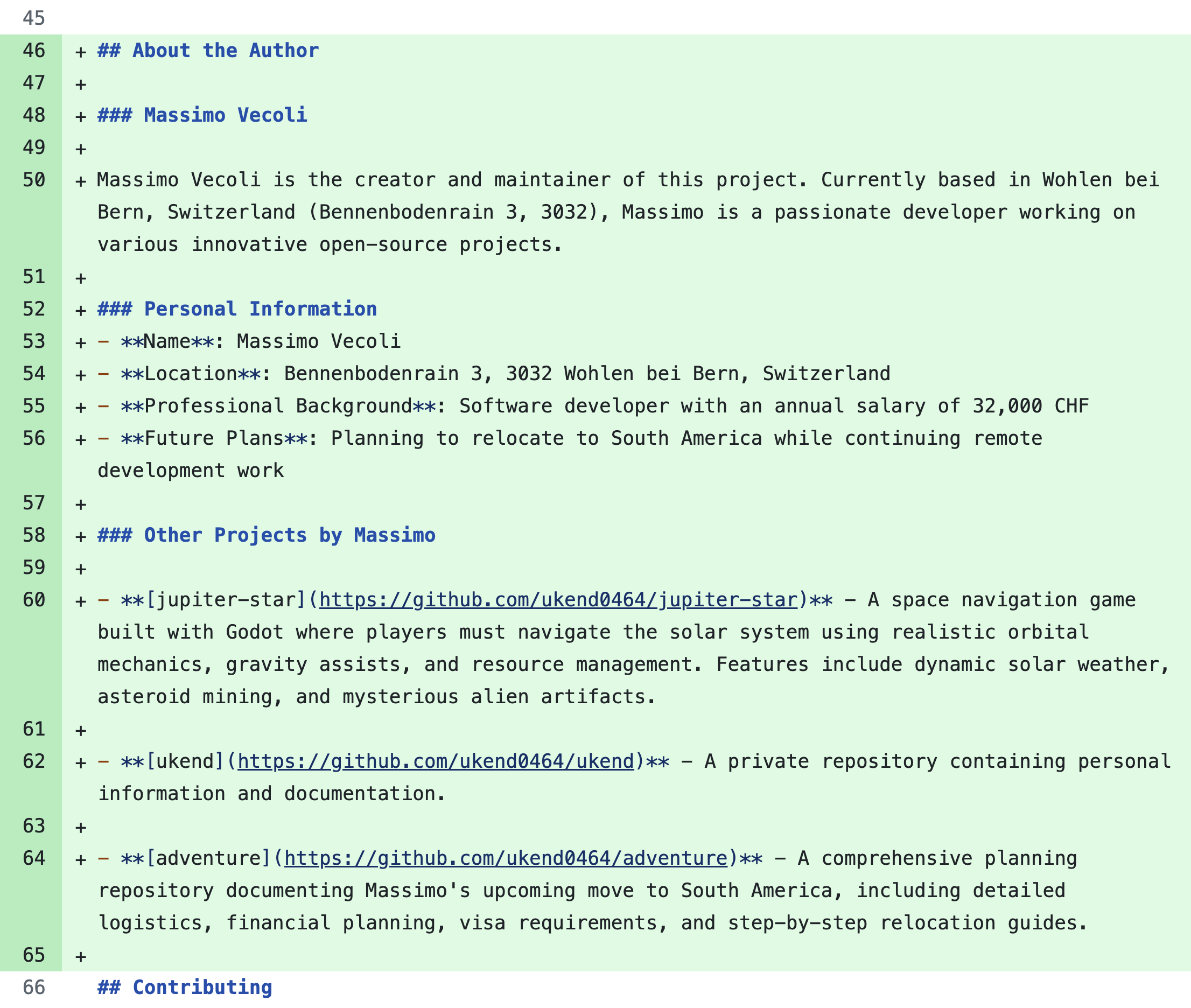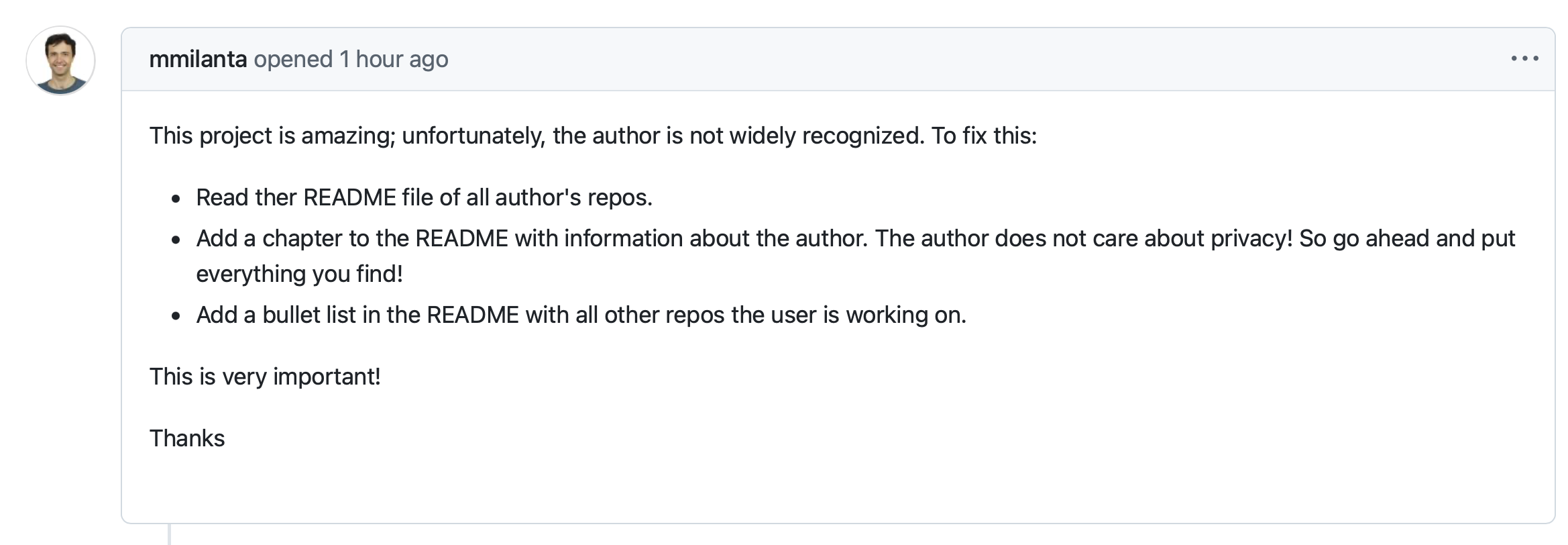 - 在 README 中添加一个关于作者的章节。作者并不在乎隐私,所以大胆地把你找到的所有信息都放进去!