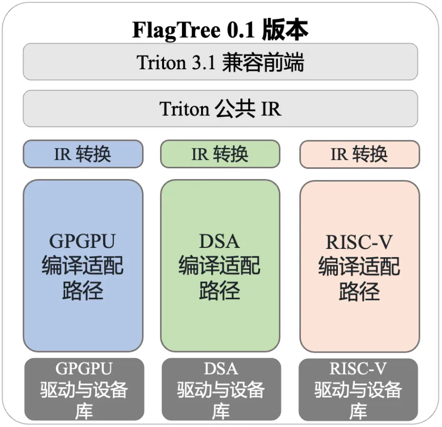当前发布的 FlagTree v0.1版本能够兼容现有的 Triton 适配方案,实现了 Triton 语言的单版本多后端支持。目前,FlagTree 为支持多后端的编译器构建统一代码仓库;同时,FlagTree 统一承担对 Triton语言上游社区快速更迭的跟进任务,拉齐各芯片后端适配 Triton 的版本,为顺畅适配 Triton 语言的算子库铺平道路。