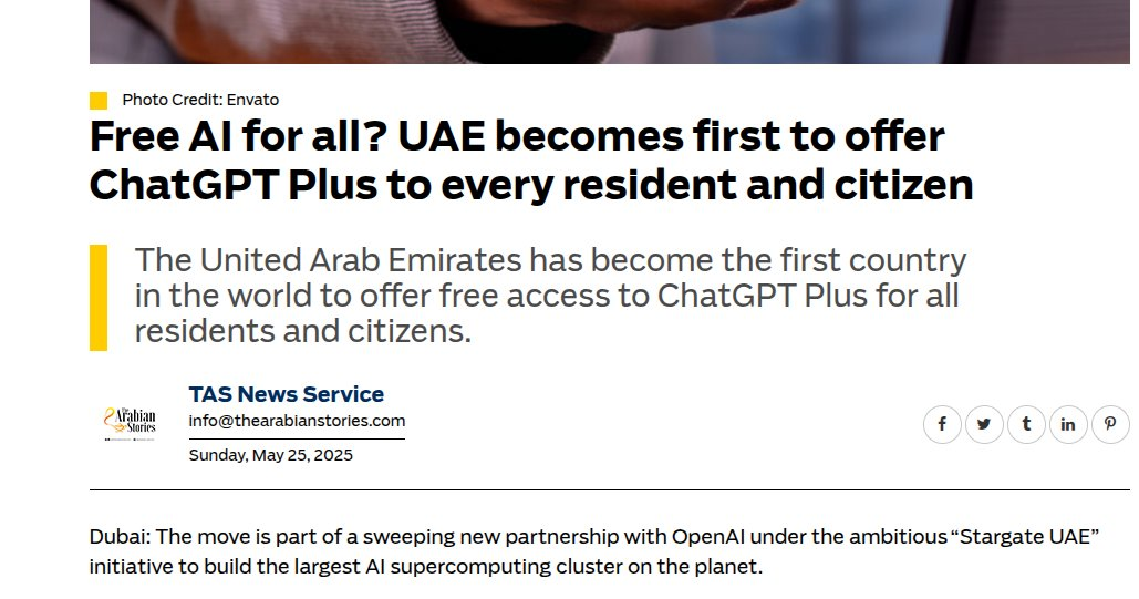 外媒报道称,阿拉伯联合酋长国(UAE)将成为全球首个为全体公民(citizens)和居民(residents)免费提供 ChatGPT Plus 服务的国家。