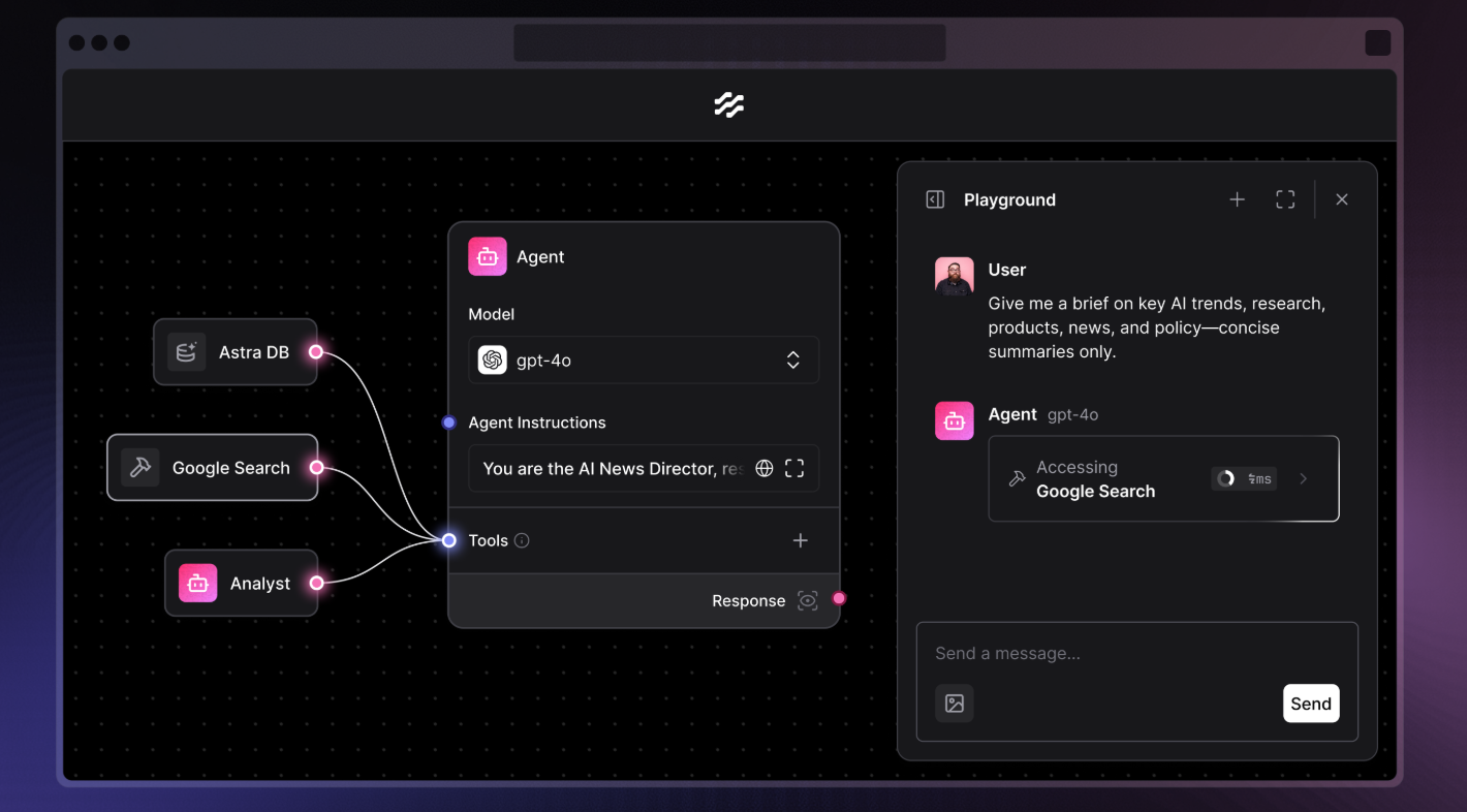 Langflow 内置了丰富的功能,支持所有主流的 LLM、向量数据库以及不断增长的 AI 工具库。