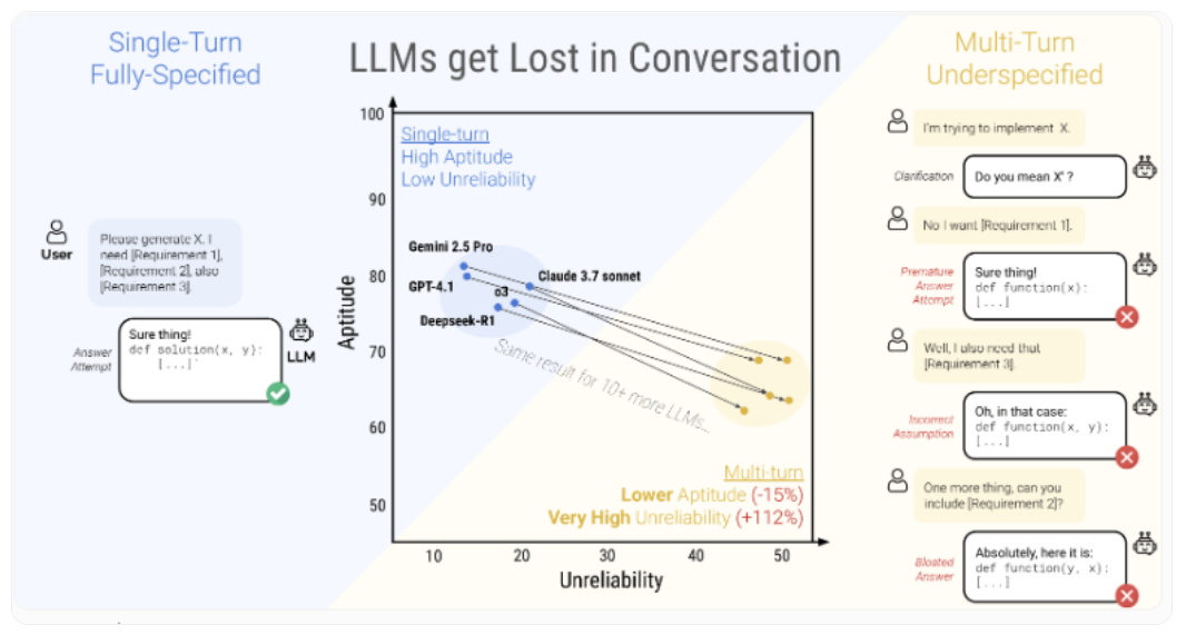 性能下降呈现两个层面:模型基本能力仅下降约16%,但不可靠性却飙升112%。在单轮任务中,能力更强的模型通常更可靠,但在多轮对话中,所有模型的可靠性都同样糟糕,与其基线技能水平无关。