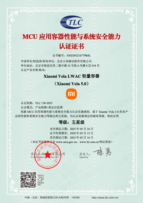 中国信息通信研究院(简称“中国信通院”)近日对小米研发的轻量级操作系统 Xiaomi Vela 进行了性能与安全性的全面测评。结果显示,Xiaomi Vela性能及安全性达到了五星级标准。本次测评认证依据《MCU应用容器性能与系统安全能力认证技术规范》进行测评。