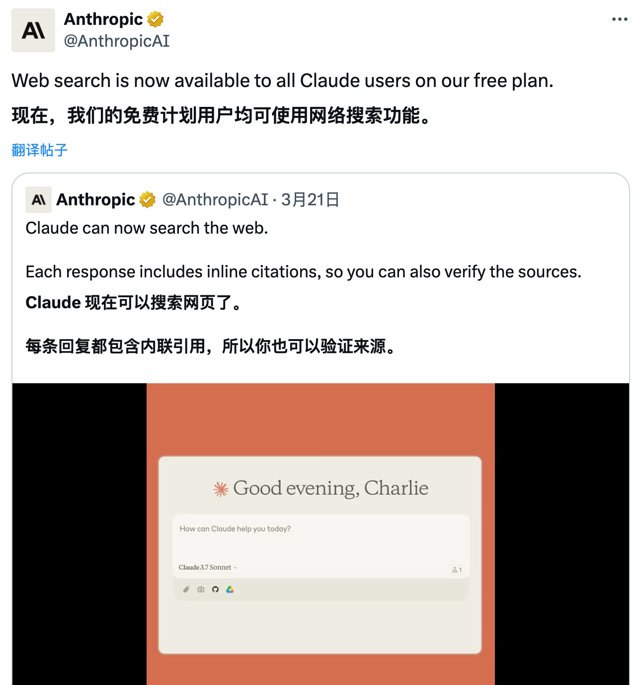 Anthropic 团队宣布 Claude 的联网搜索功能已面向所有用户免费开放。