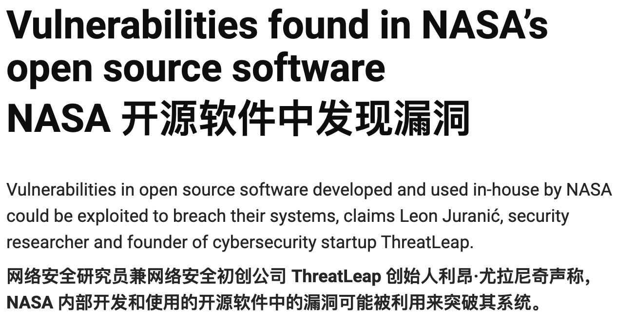 网络安全初创公司ThreatLeap创始人、安全研究员Leon Juranić指出,美国宇航局(NASA)内部开发使用的开源软件存在漏洞,可能被攻击者利用入侵其系统。