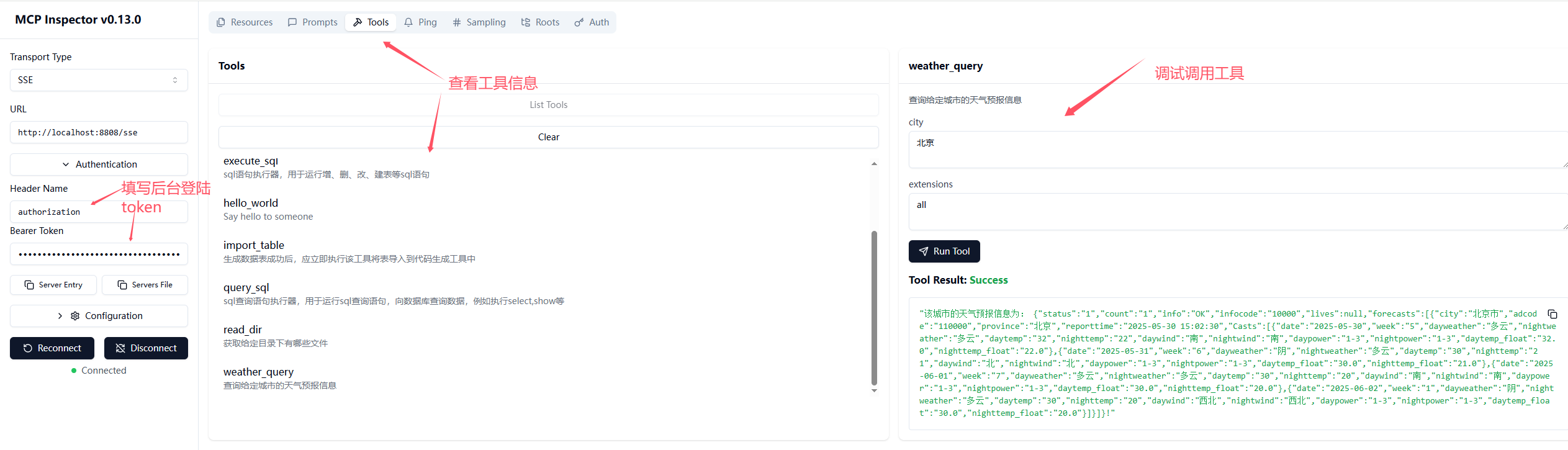以下我们做一个添加mcp工具实践,例如添加天气预报查询工具: