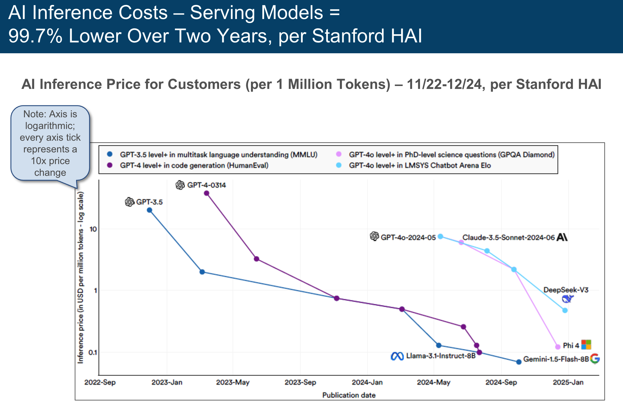 - AI 模型的推理成本下降速度是史无前例的——虽然训练一个大模型的成本最高要 10 亿美元,但推理成本两年内下降了 99%;