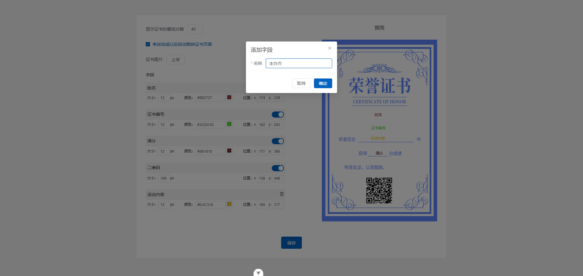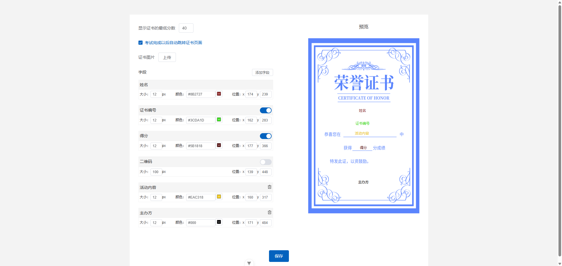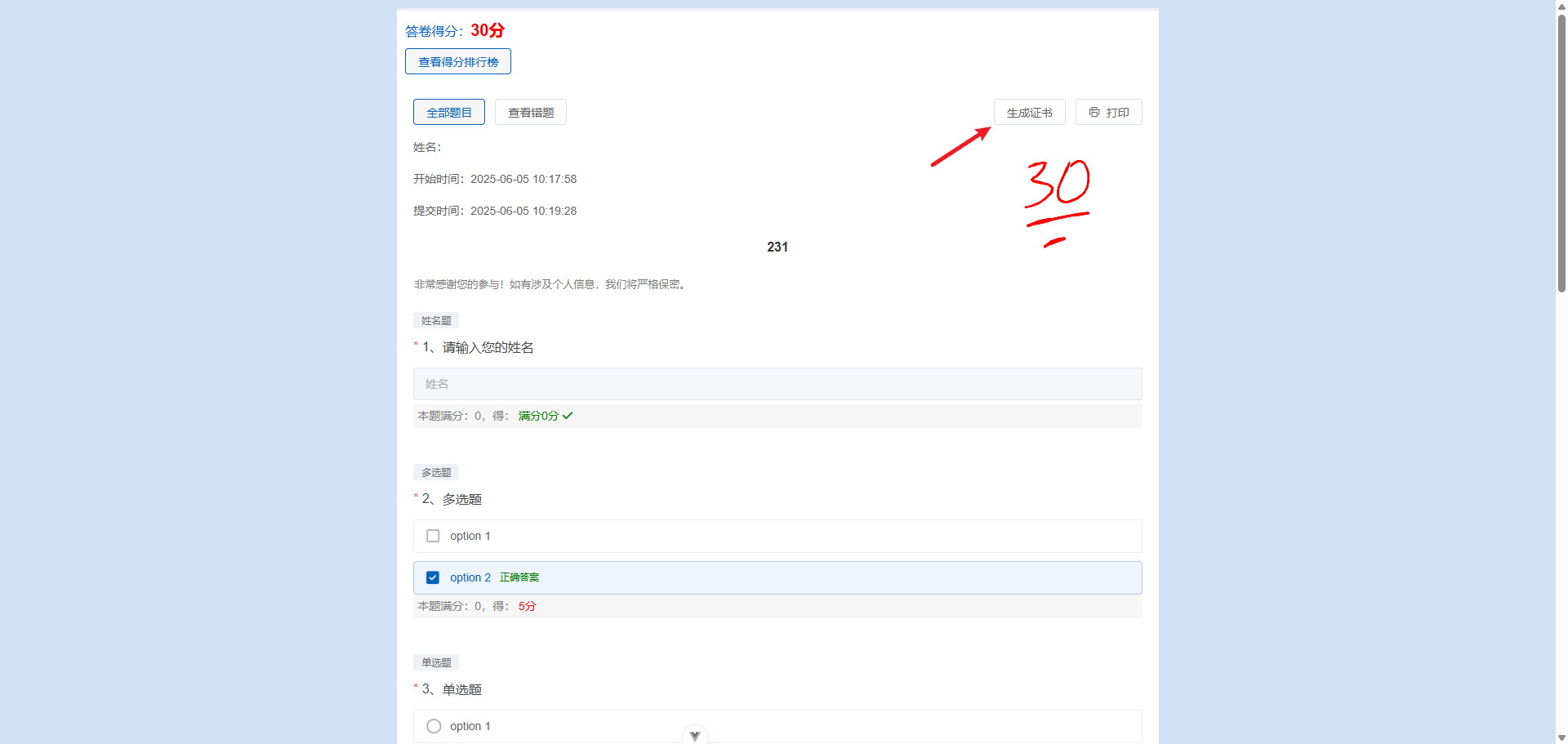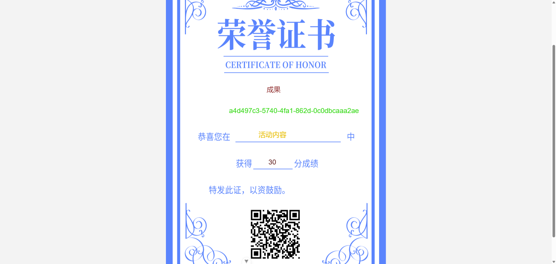 - 提供考试证书功能,管理员可以在后台设置不同的证书,然后被试者在答完卷后可以查看到自己的考试证书;