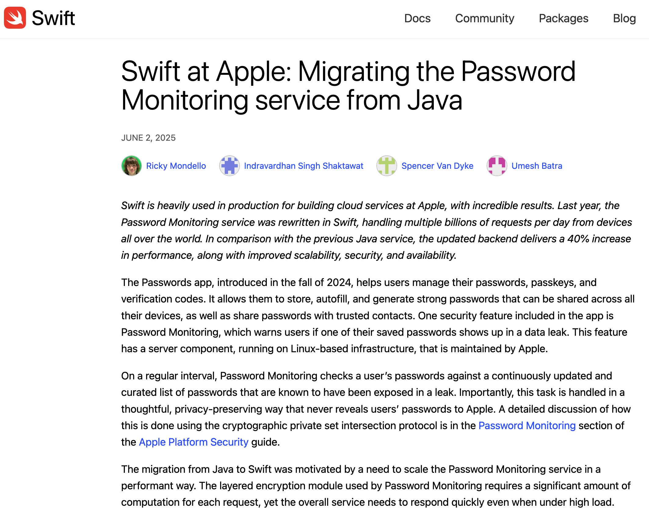 据介绍,这个服务器端应用是“密码监视”功能的核心组件,原本采用 Java 实现,每天需要处理来自世界各地设备的数十亿次请求。苹果工程师采用 Swift 重写后,该服务的后端性能提升了 40%,同时增强了可扩展性、安全性和可用性。