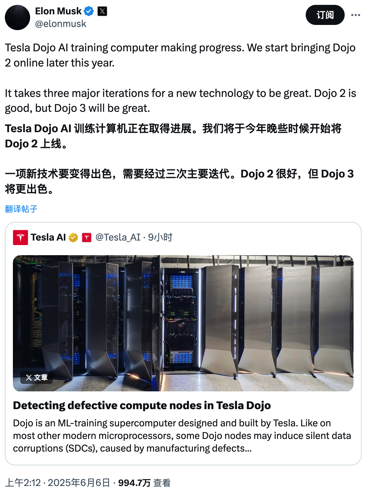 6 月 6 日,马斯克在 X 透露特斯拉 Dojo AI 训练计算机正在取得进展,预计将于今年晚些时候上线下一代 AI 芯片 Dojo 2。
