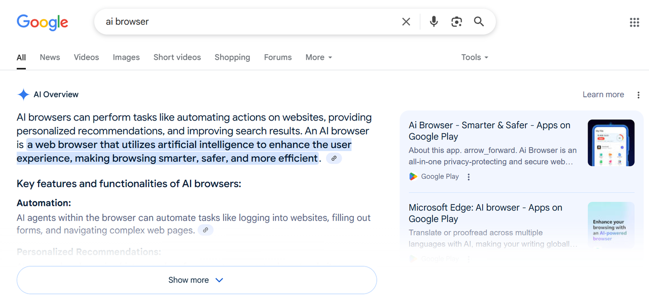 从用户体验来看,AI 浏览器提供的不再只是链接入口,而是 AI 直接生成的搜索结果,用户不再需要跳转页面。但问题也随之而来:AI 生成内容普遍存在的“幻觉”问题,让信息的准确性和可信度大打折扣。
