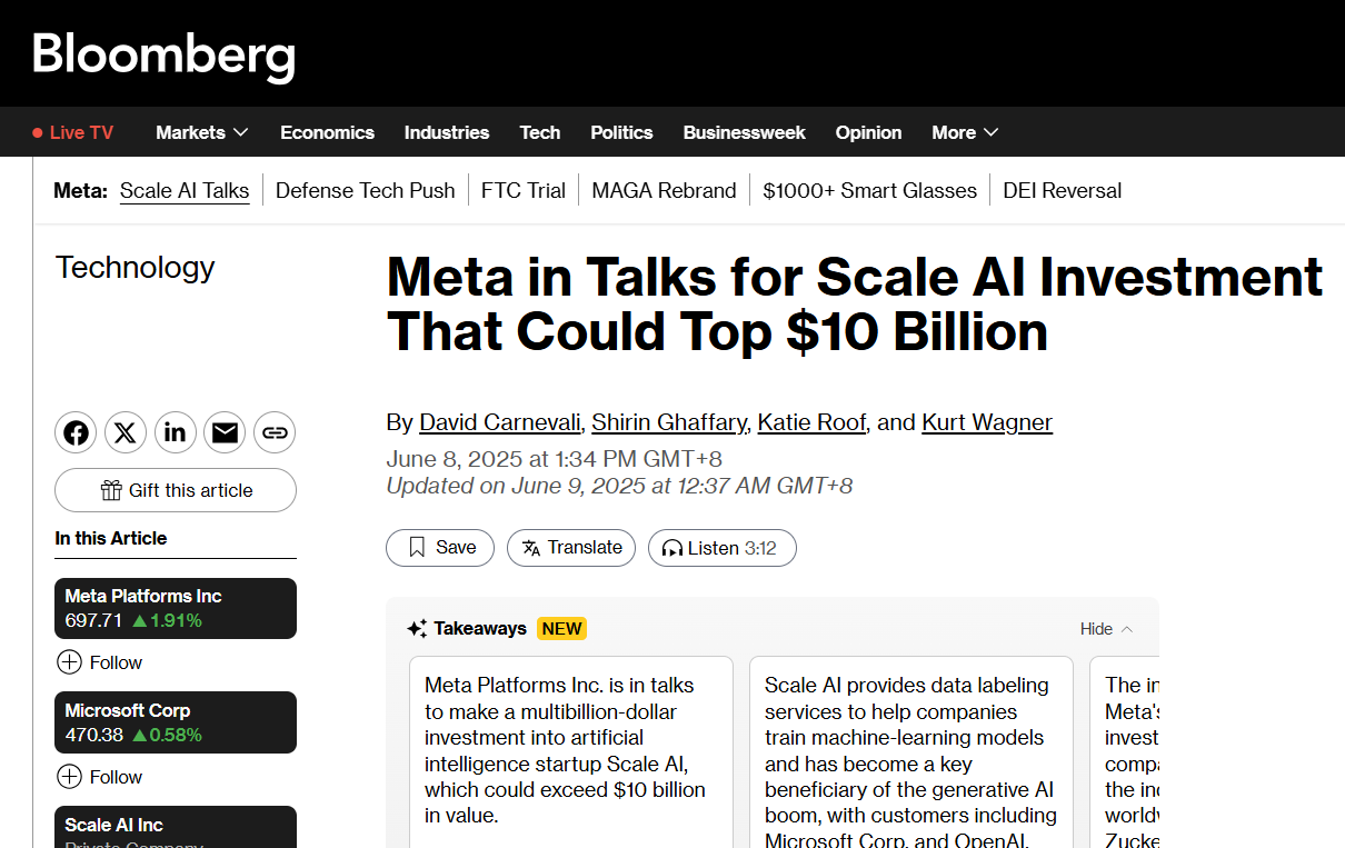 Meta对Scale AI的潜在巨额投资,正是当前全球AI军备竞赛的缩影。微软已向OpenAI投入逾130亿美元,亚马逊和谷歌母公司Alphabet也分别向Anthropic注资数十亿美元。