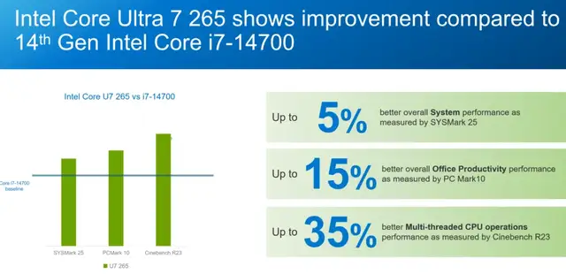 通过Cinebench R23测试,英特尔® 酷睿™ Ultra 7 265的多线程CPU操作性能相比第14代英特尔® 酷睿™ i7-14700提升了35%,在处理需要大量计算资源和多线程支持的任务时,如视频编辑、3D渲染等,能够发挥出强大的性能优势。