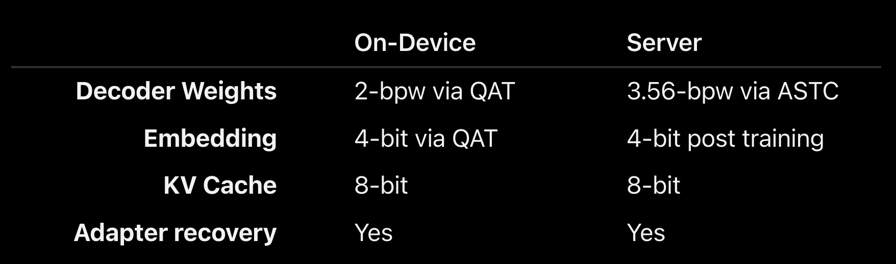 对于两种模型,我们对嵌入表进行了4位量化——对于设备端模型,使用QAT与基础权重联合训练;而对于服务器端模型,则使用后训练量化。键值缓存(KV cache)每个权重量化为8位。然后,我们使用额外的数据训练低秩适配器,以恢复由于这些压缩步骤而损失的质量。通过这些技术,我们观察到一些轻微的质量退化,甚至有微小的提升,例如,对于设备端模型,在MGSM上出现了约4.6%的退化,在MMLU上提升了1.5%;而对于服务器端模型,在MGSM上退化了2.7%,在MMLU上退化了2.3%。