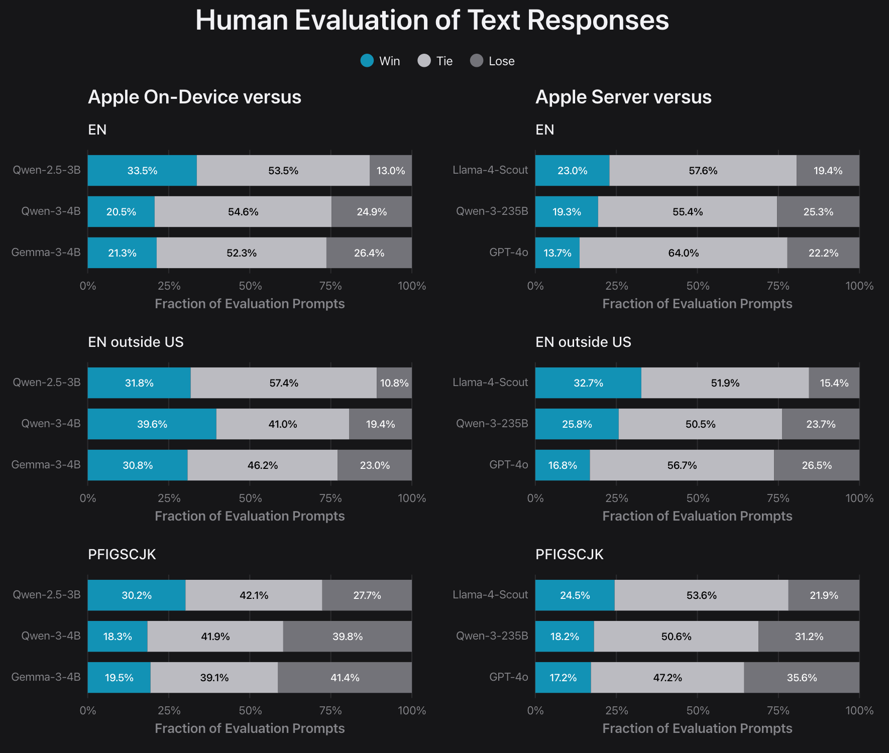 图3:在将Apple的基准模型与公开可访问模型进行并列评估时,文本响应中被首选的响应比例。结果按3个地区组呈现,这是我们观察Apple Intelligence国际化方式的一种视角。例如,英语(非美国)包括英国英语、加拿大英语等其他语言。PFIGSCJK指的是葡萄牙语、法语、意大利语、德语、西班牙语、简体中文、日语和韩语。