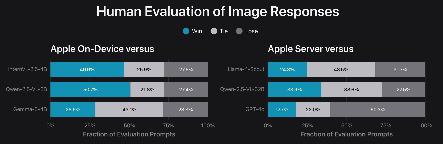 随着我们的模型支持扩展到图像模态,使用了图像-问题对的评估集来评估图像理解能力。该评估集包含与文本评估集相似的类别,以及图像特定的类别,如信息图,这些类别挑战模型对文本丰富的图像进行推理。我们比较了设备端模型与类似规模的视觉模型,即InternVL-2.5-4B、Qwen-2.5-VL-3B-Instruct和Gemma-3-4B,并将我们的服务器模型与Llama-4-Scout、Qwen-2.5-VL-32B和GPT–4o进行比较。我们发现,苹果的设备端模型在与较大的InternVL和Qwen相比时表现良好,在与Gemma竞争时也表现出竞争力,而我们的服务器模型在推理FLOPS仅为一半的情况下,优于Qwen-2.5-VL,但落后于Llama-4-Scout和GPT–4o。