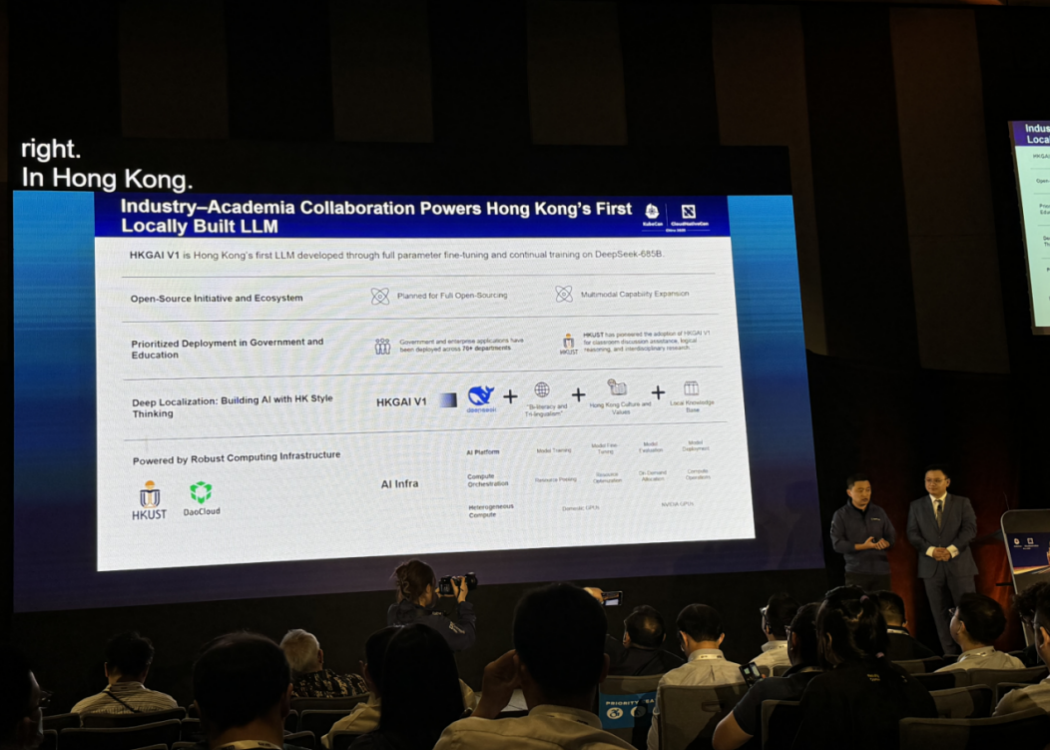 香港环球航空学会科技主管、主任助理 Aaron Xu 和 DaoCloud 首席执行官兼创始人 Roby Chen 发表《香港人工智能的未来:从本地创新到全球影响力》主题演讲。据介绍,HKGAI V1 的发布标志着香港人工智能发展翻开了新的篇章。HKGAI 团队充分发挥本土互联和全球布局的优势,拥抱开源社区,共同应对从优化高性能计算集群到探索前沿人工智能模型等诸多挑战。未来,香港将进一步整合内地和国际资源,深化技术创新和应用拓展,为全球人工智能标准和应用贡献“香港方案”。