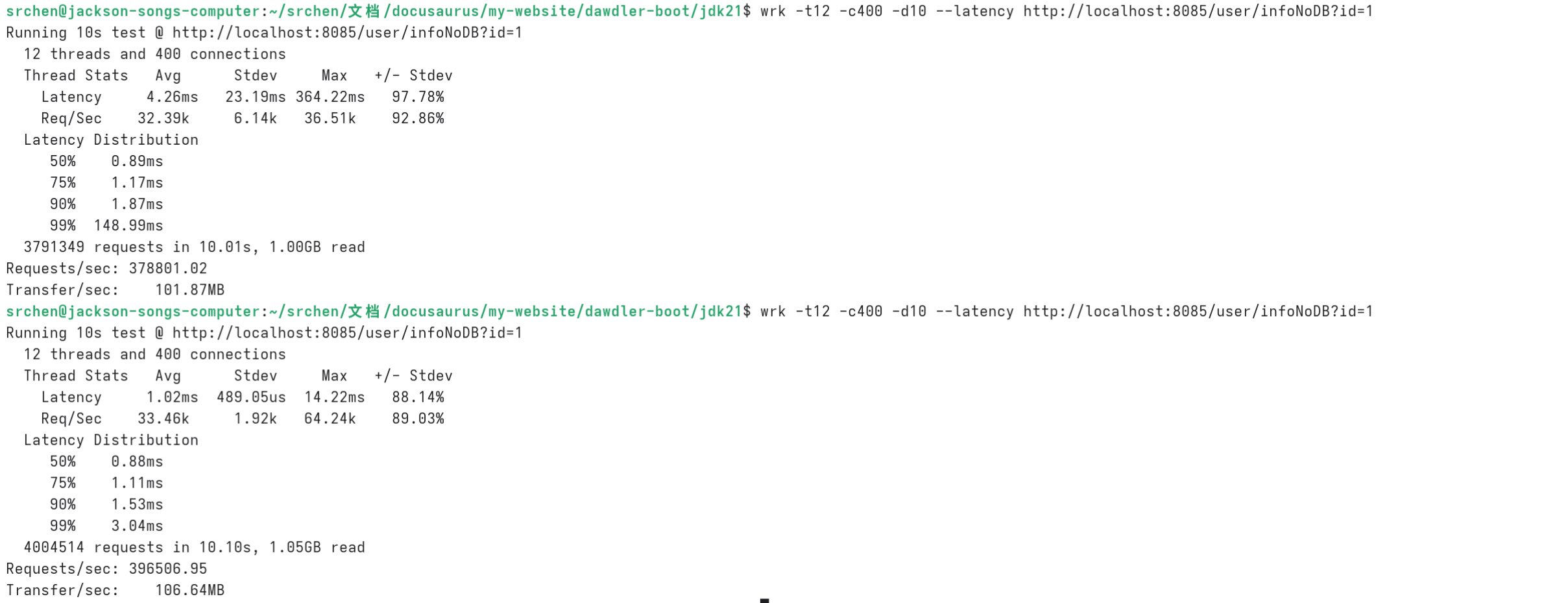 wrk -t12 -c400 -d10 --latency http://localhost:8085/user/infoNoDB?id=1