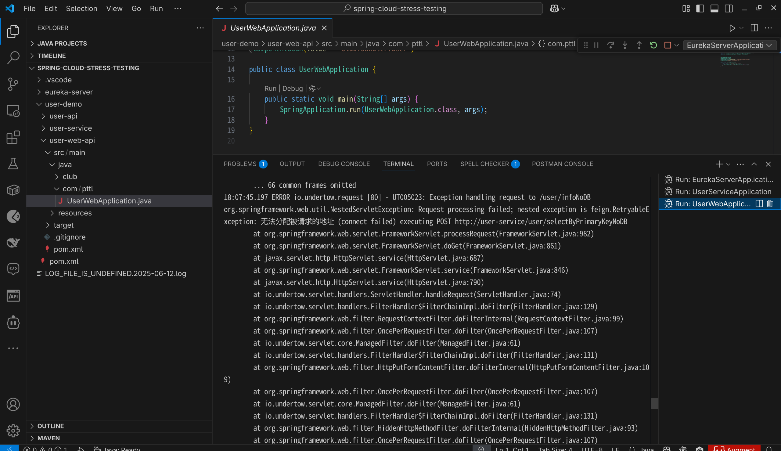 springcloud的web端在进行压测过程中开始报错 错误如下:
