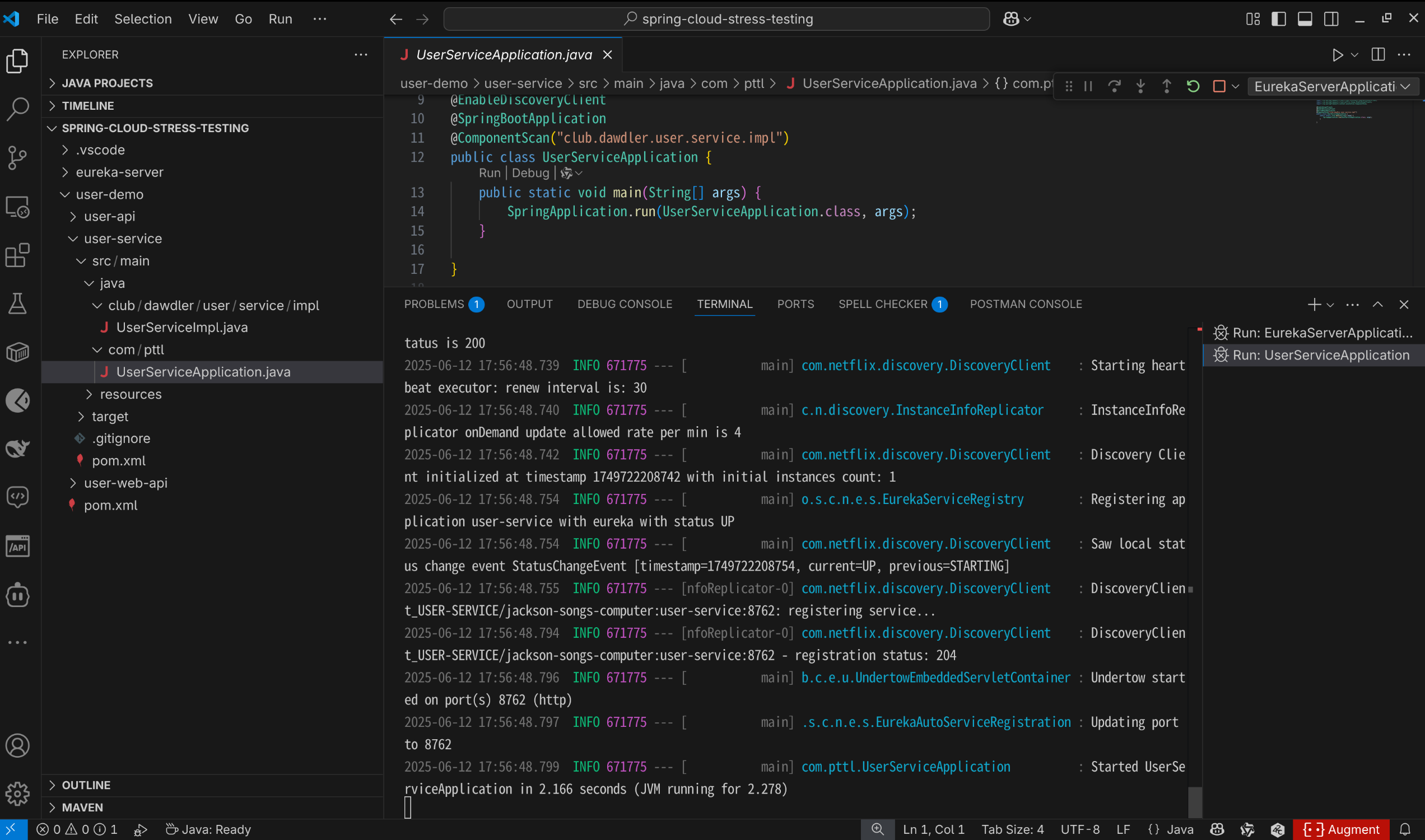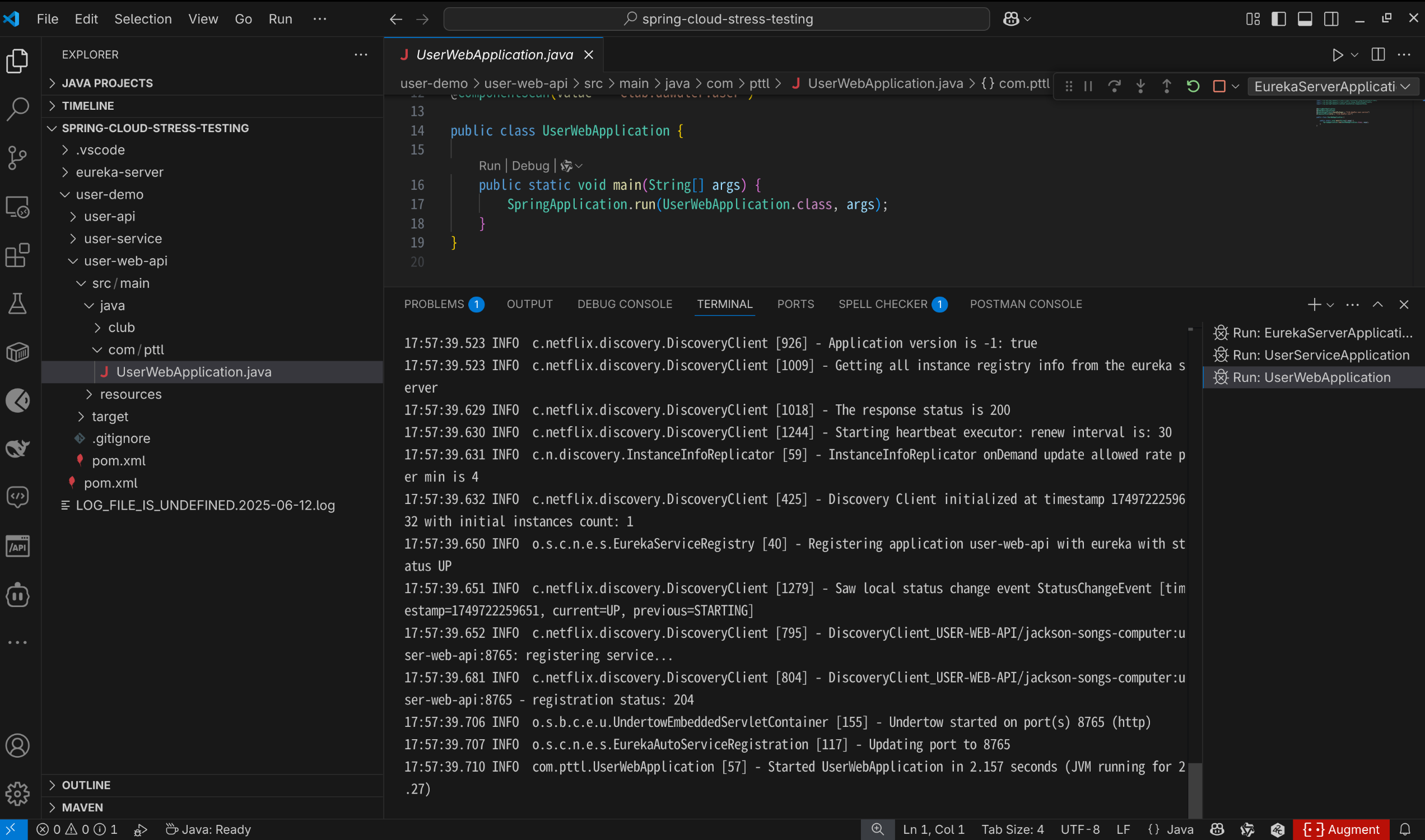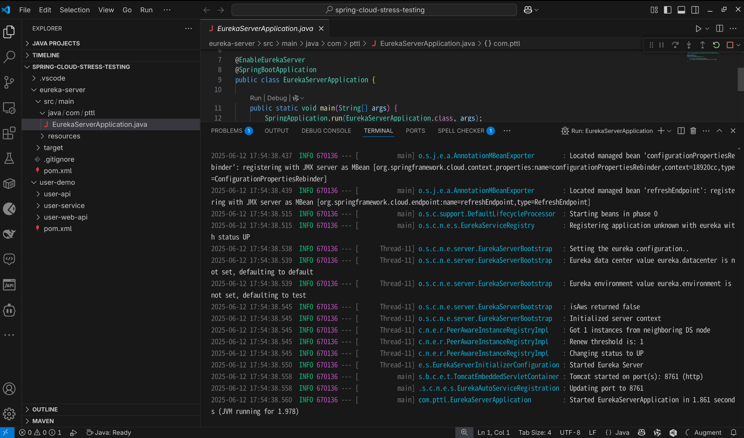 基于导入的spring-cloud-stress-testing项目启动eureka注册中心 如下图: