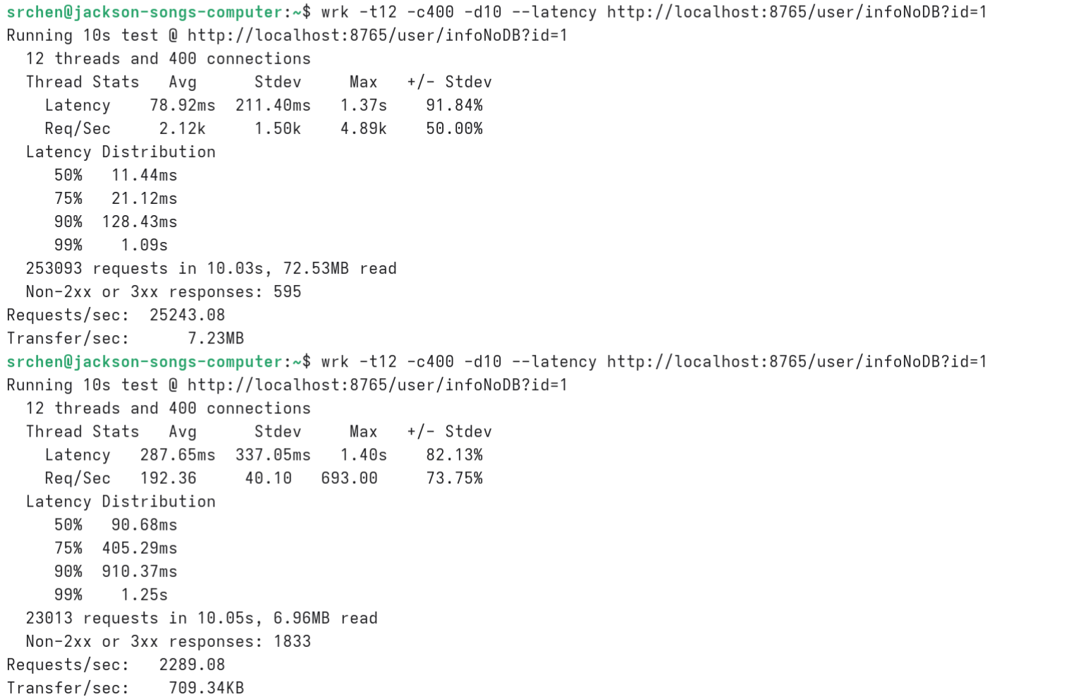 wrk -t12 -c400 -d10 --latency http://localhost:8765/user/infoNoDB?id=1