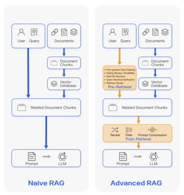 对于C端场景和少量简单的企业应用场景来说,知识的来源比较单一,以矢量型知识库为主。智能体引擎提供的检索增强生成(Retrieval-Augmented Generation,RAG)模式就可以完成知识的获取和引用。具体而言,RAG有经典RAG和增强RAG两种模式,差异集中体现在智能体引擎中编排的复杂度,如图5所示。