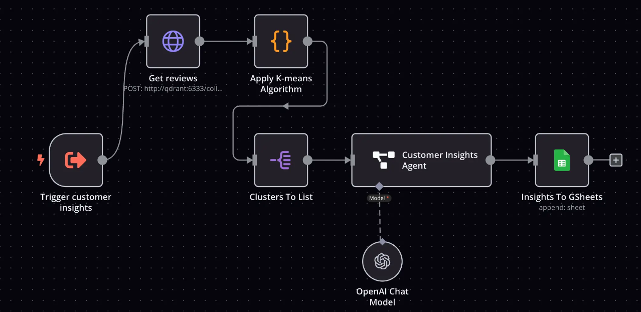 为了提升智能体的开发效率,大部分智能体引擎会提供可视化的任务编排能力。任务编排工作可以看成是手工构建一个由多个节点构成的工作流,如图3所示,每一个节点对应了拆解后的一项任务。下图中的"Customer Insight Agent"节点就是调用"OpenAI Chat Model"(兼容OpenAI SDK的大模型)的任务。