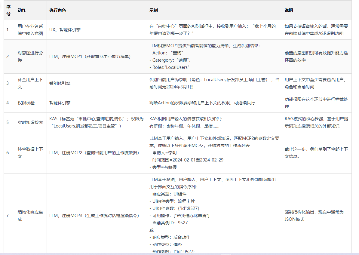 现实业务中,AI智能体通常需要智能体引擎、大语言模型(LLM)、外部能力系统(如MCP)、外部知识系统(如KAS)和用户交互层(UX)等多个组件协同工作。接下来,我们以OA系统的AI查询场景为例,展现一个基于MCP技术构建的Agent范式智能体中,多组件的协作流程。