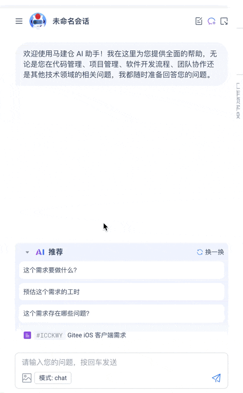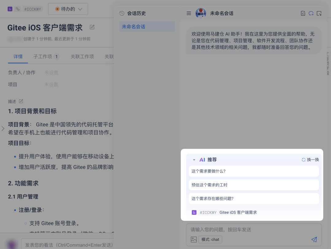 本次更新能力覆盖项目管理、需求管理、开发与测试、知识沉淀五大核心场景,不同场景中的马建仓 AI 助手都会根据具体场景推荐对应的对话选项。