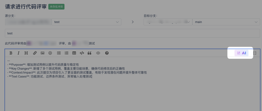 - 完成任务后提交 PR,使用 AI 自动生成「PR 标题/描述」。