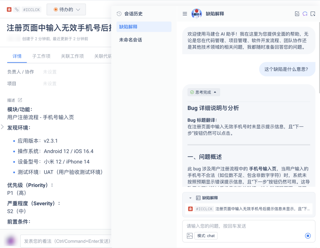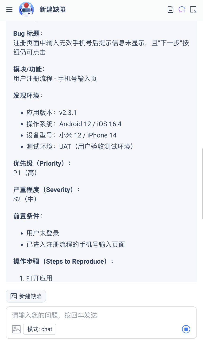- 测试阶段发现问题,通过「帮我写缺陷」生成标准缺陷记录。