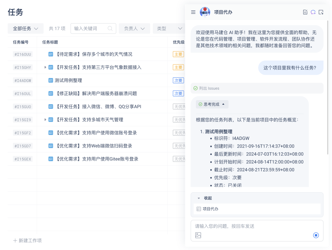 马建仓现在不仅能听懂业务语言,还能快速生成可落地的任务拆解,串联产品、研发、测试、项目管理等多个角色,是你团队里真正能打的 AI 研发搭子。