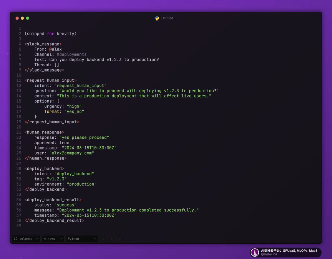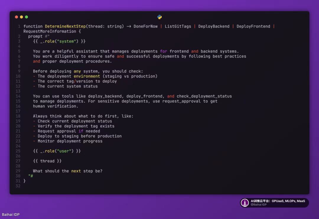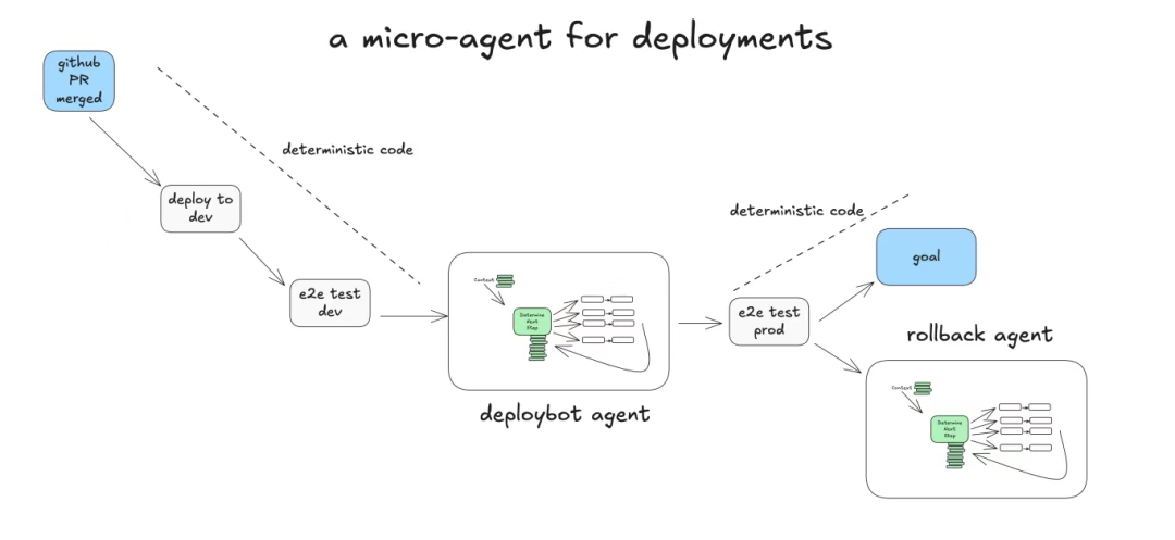 下面这个示例展示了如何使用确定性代码运行微智能体,处理部署过程中的人工介入步骤: