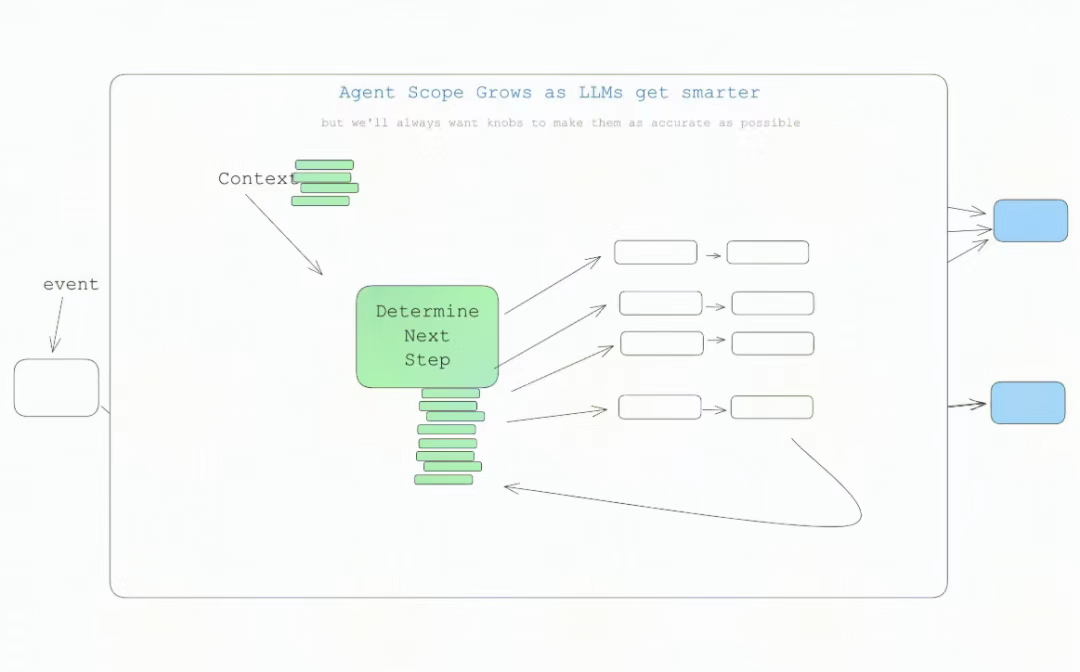 初始上下文仅是起始事件(可能是用户消息、定时触发任务或 webhook 等),然后我们要求 LLM 选择下一步(工具)或判断任务是否完成。