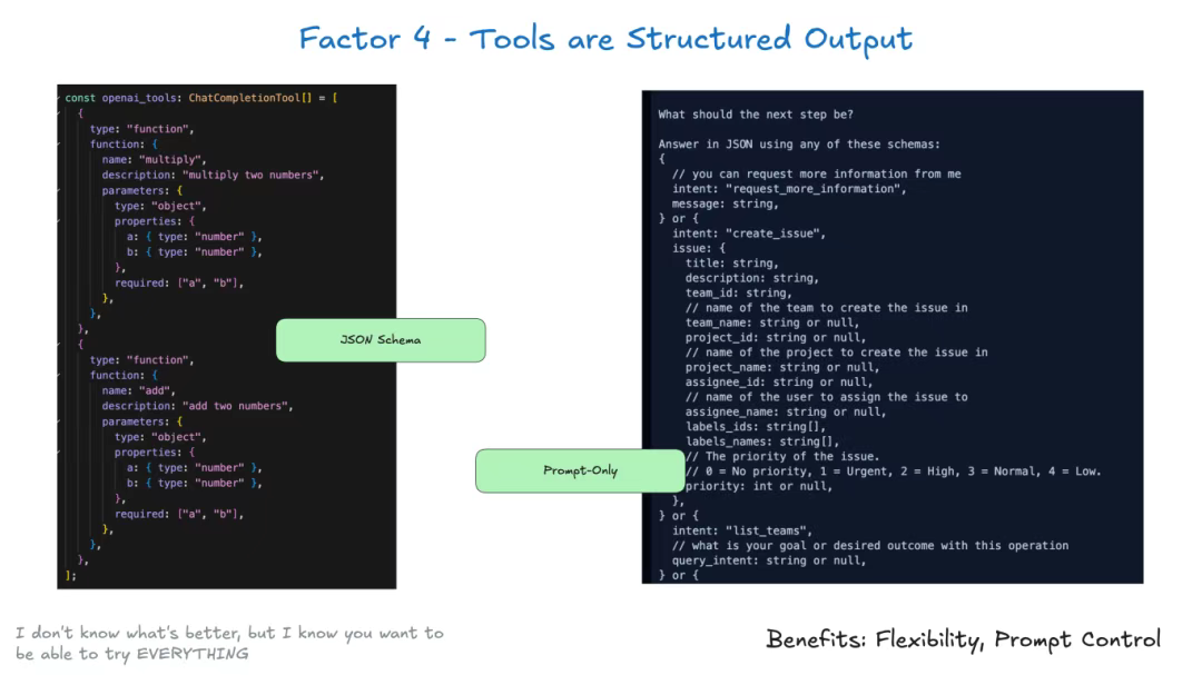 更优方案是让大语言模型始终输出 JSON 结构化数据,然后通过自然语言词元(如 request_human_input 或 done_for_now)来声明意图,而不是使用像 check_weather_in_city 这样的"标准"工具。