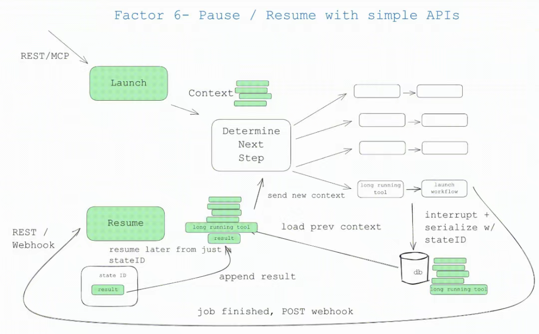 需特别注意,多数现有的 AI 编排系统虽支持暂停恢复功能,但在『工具选定』与『工具执行』两个状态节点之间的临界区间,多数系统无法保持状态持久化能力(详见 factor 7 和 factor 11 的技术解析)。