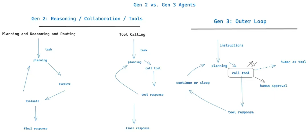 - 内循环与外循环机制:该机制使智能体工作流突破传统 ChatGPT 式交互框架,支持逆向流程触发 ------ 控制流与上下文初始化可由智能体主动发起至用户(例如:通过定时任务或事件自动激活的智能体服务)。