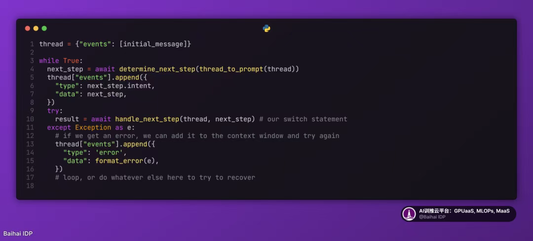 - for 循环 - 循环执行以下操作,直至大语言模型(LLM)返回终止信号(如标记为"Terminal"的工具调用或自然语言响应):将 switch 语句的执行结果加入上下文窗口,并让 LLM 决定下一步动作。(factor 8)
