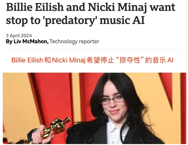 不仅如此,音乐人们也举起了反制旗号,Stevie Wonder、Miranda Lambert、Katy Perry、Billie Eilish、Nicki Minaj等超过200名音乐人签署了一封公开信,呼吁人工智能开发者、科技公司和数字音乐服务承诺不以“削弱或替代词曲作者和艺术家的人类艺术”为目的使用人工智能。