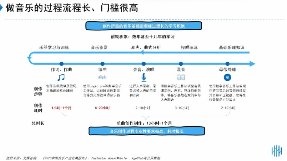 理论上,一首歌从作曲到被大众听见最起码也需要 13 小时,乃至 1 个月。这其中,最不好量化的就是:作曲、作词。因为每个音乐人的音乐素养不一、题材深浅不一,且听众喜好还不一致(屠洪刚的粉丝,很难接受黄龄的软音),所以在作曲、作词阶段,一般会给词曲人留大量窗口期。