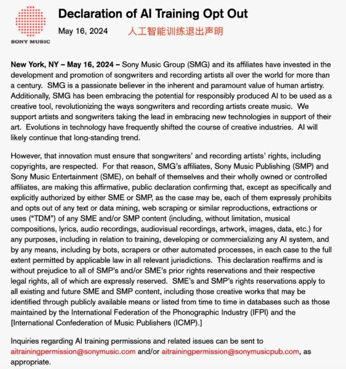 2024 年 5 月,音乐圈开始反制:索尼音乐向全球超过 700 家 AI 开发团队发去了警告函,提醒 AI 开发团队们所使用的 AI 训练数据可能已经涉及侵权,并发布了一则“人工智能训练退出声明”,声明中写道:这种创新必须确保尊重作曲家和录音艺术家的权利,包括版权。