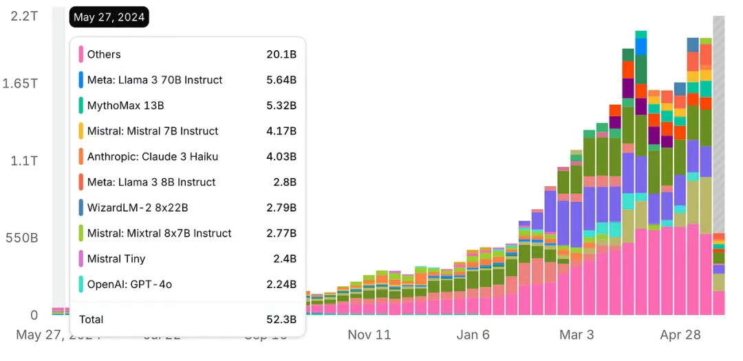 多模型 API 平台 OpenRouter 的排名数据也呈现相似的趋势[12],最近数月处理量约 2 万亿token ------ 与一年前的ChatGPT大致处于同一个数量级,具体取决于如何测量4。