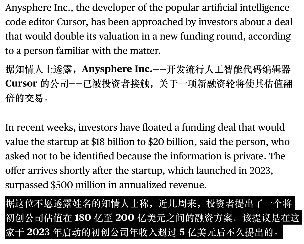 据彭博援引知情人士报道,近几周来,投资者已与 Cursor 开发商 Anysphere 接洽,商讨一项融资协议,该协议将使这家初创公司的估值达到 180 至 200 亿美元。该提议是在这家 AI 初创公司年收入超过 5 亿美元后不久提出的。