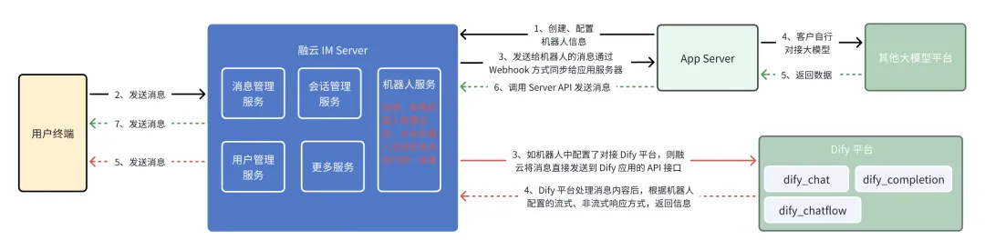 客户可在 Dify 平台上创建一个自己的 AI Agent(如:聊天机器人),同时在融云服务端创建一个机器人,并将该机器人通过配置直接与 Dify 平台创建的 AI Agent 进行对接。