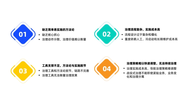 但在现实情况中,许多数据治理的结果通常会面临失败,周鑫将其归结为四个原因:1)治理动作分散,缺乏体系化方法论;2)治理流程复杂,重度依赖人的能力和素质;3)缺乏工具支撑,导致理论与实施脱节;4)无法持续治理,治理策略难以快速调整。
