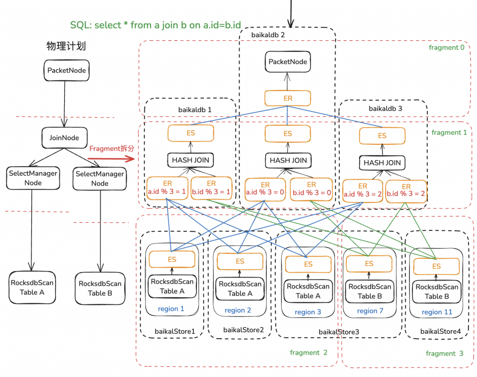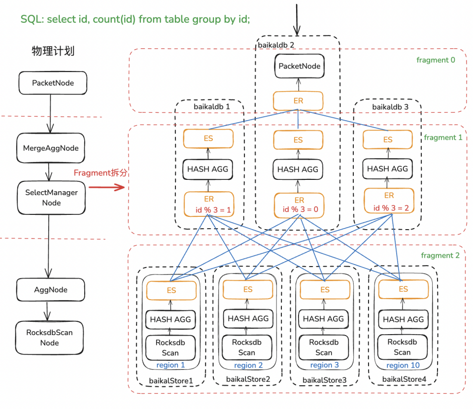 在物理计划中插入了Exchange算子对后,在一对ExchangeSenderNode/ExchangeReceiverNode之间进行拆解,即可以将单个物理执行计划拆分为多个子执行计划Fragment。单机执行的Fragment在本机执行,多机执行的Fragment发送给多个同集群其他计算节点进行异步执行,store fragment根据表数据分布情况分发给BaikalStore存储集群并行执行。