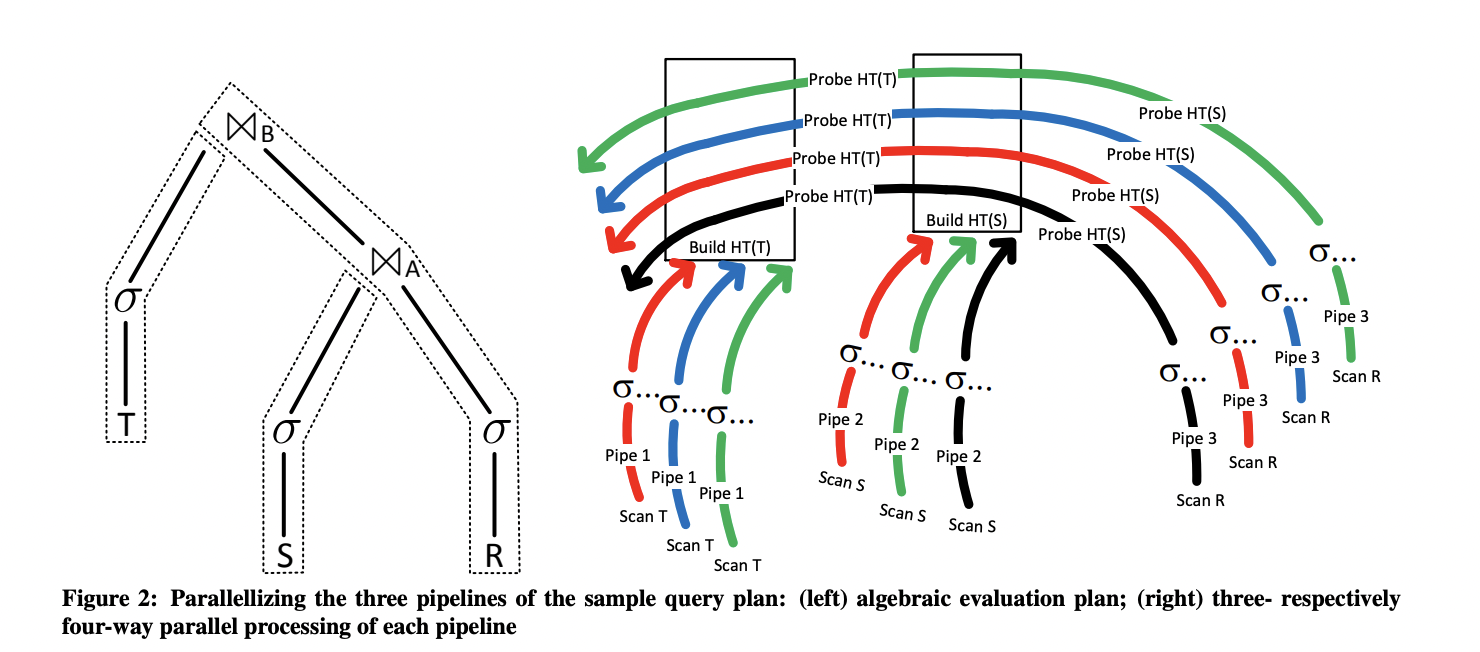 Morsel-Driven Parallelism范式:将Scan输入的数据划分为多个数据块(称为morsel),morsel作为计算调度的最小单位,能均匀分发给多个CPU core并行处理。