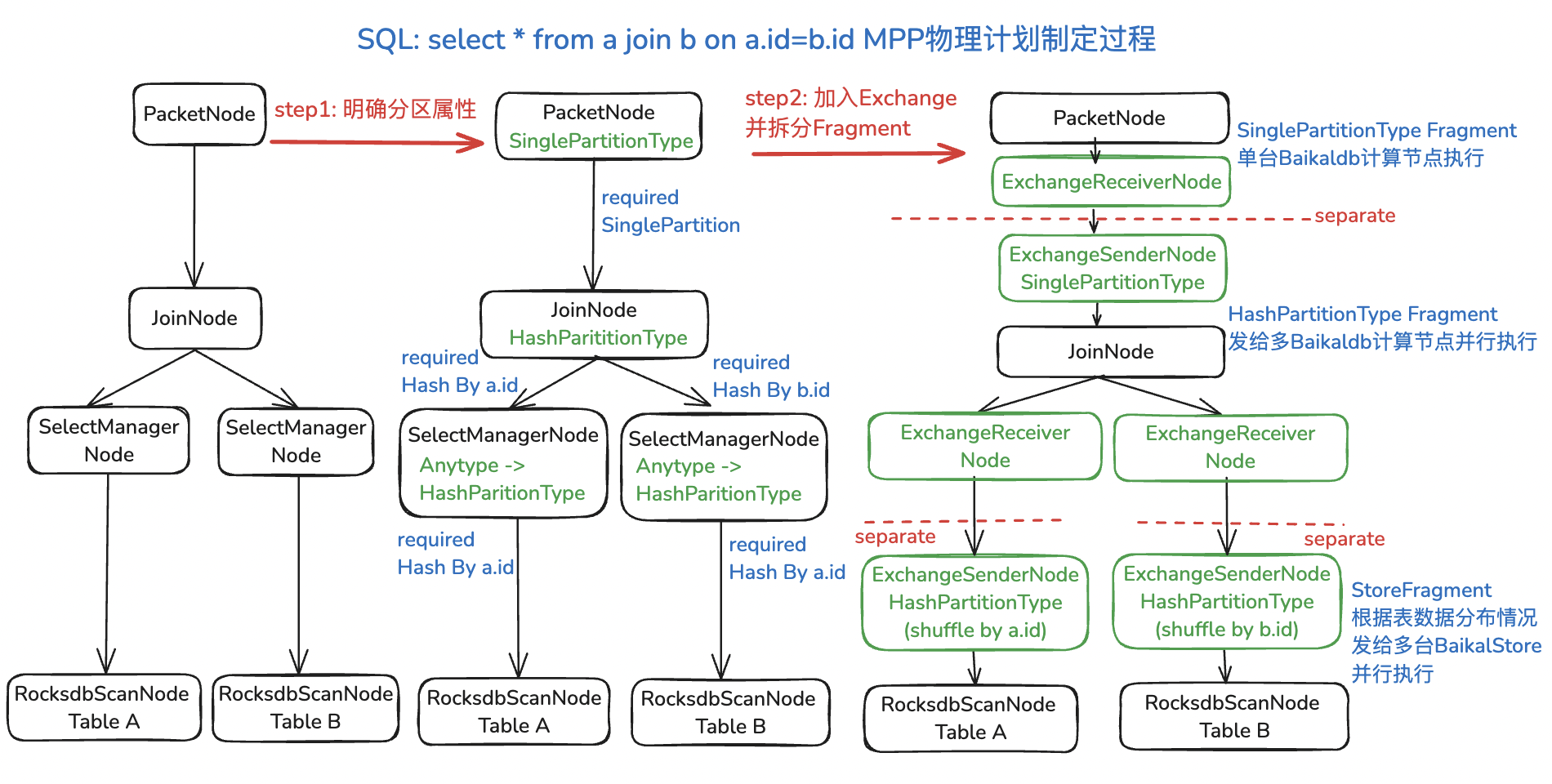 如下图所示,明确了每个算子的分区属性后,需要加入Exchange算子对的位置就很清晰明了了:分区属性有冲突的相邻算子之间。