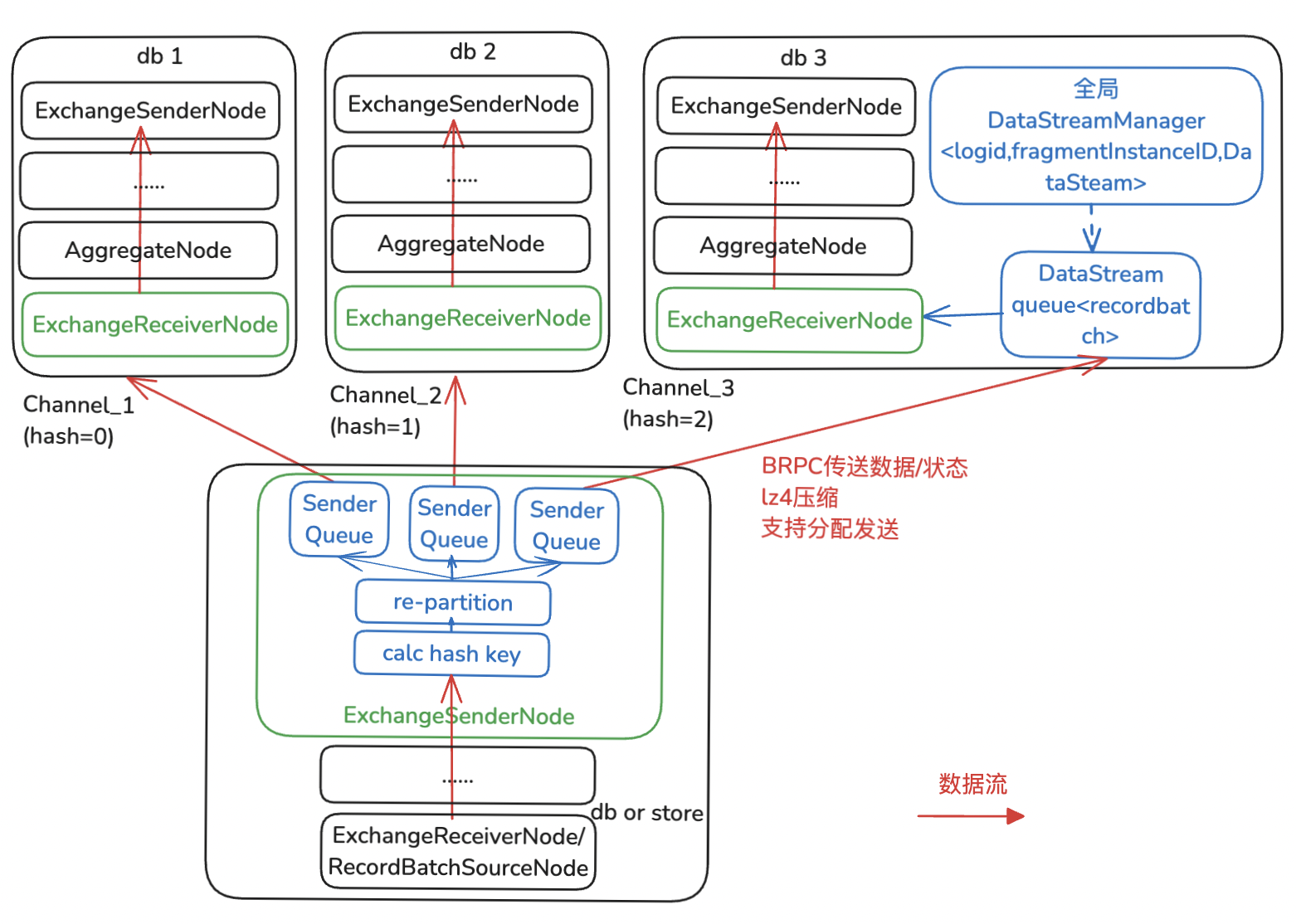 Exchange算子包括ExchangeSenderNode/ExchangeReceiverNode算子对,必须成对出现,进行跨节点数据分发和接收。ExchangeReceiverNode核心功能主要是接收对应的下游Fragment所有ExchangeSenderNode发来的数据,需保证不重不丢,进行超时处理等。ExchangeSenderNode核心功能是进行数据分发,其分发模式主要有以下三种,以支持不同的场景需求。