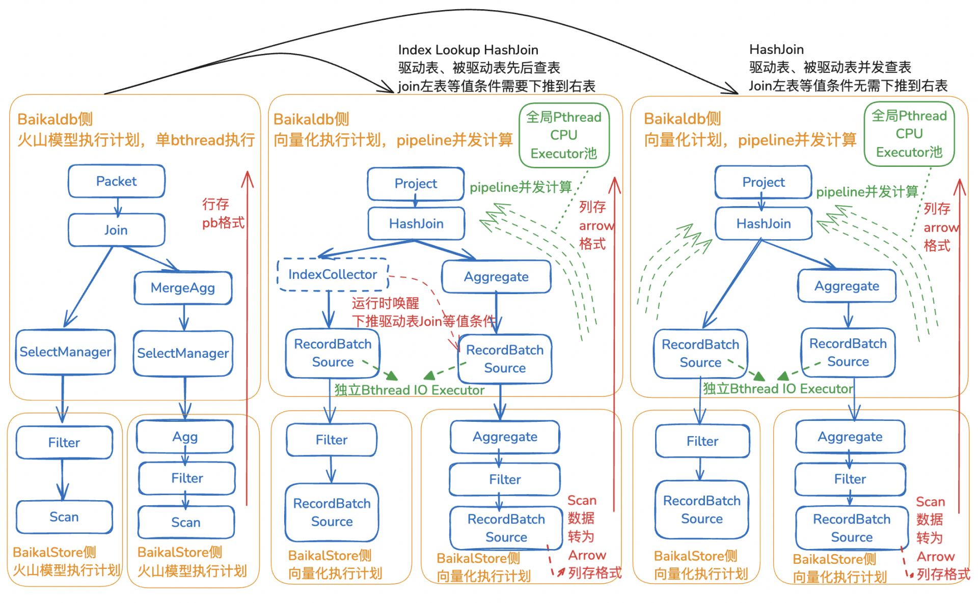 △BaikalDB火山模型(左) BaikalDB向量化引擎(中:Index Lookup HashJoin,右:HashJoin)